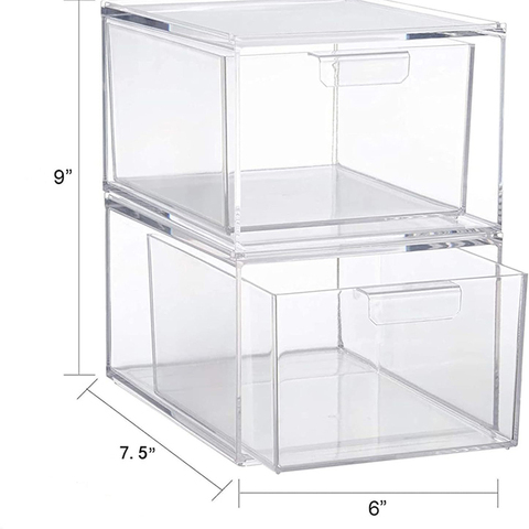 ลิ้นชักพลาสติกใสแบบวางซ้อนได้2ชิ้นกล่องเก็บของใช้ในครัวเรือนสำนักงานกล่องเก็บเครื่องสำอาง